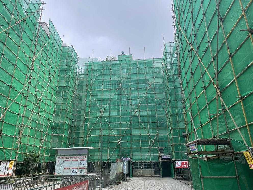 近日,记者在息烽县城南大街两侧、龙港新城等小区看到,这些小区楼栋外围都搭上了脚手架,安装上了绿色防护网,工人正在忙碌作业,检查房屋外墙瓷砖脱落、瓷砖空鼓等情况。