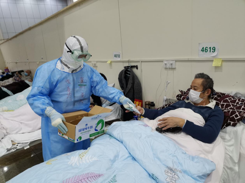 在武汉江汉方舱医院,涂真均给病人发放药物
