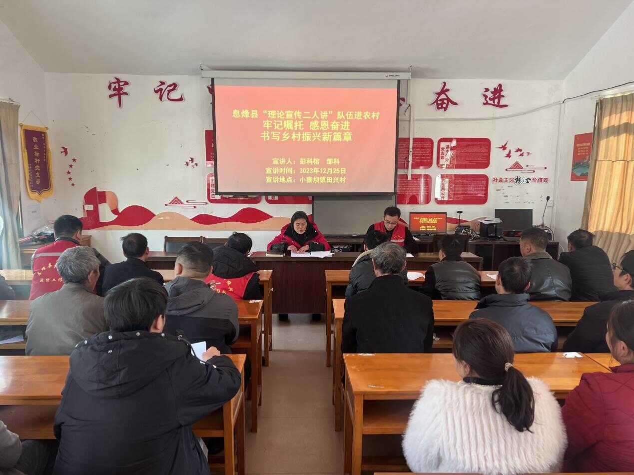 本次“理论宣传二人讲”由息烽县委党校讲师、田兴村驻村队员邹科和小寨坝镇田兴村党支部书记彭科榕以一人讲理论、一人讲实践的形式展开。宣讲中,邹科围绕党的二十大精神,用通俗易懂的语言向大家讲解党的二十大报告中的新思想、新理论,以及乡村振兴“产业兴旺、生态宜居、乡风文明、治理有效、生活富裕”这二十字的深刻内涵。彭科榕则结合田兴村实际,用真挚的情感和鲜活的事例,围绕生产生活环境、乡村振兴以及产业发展等方面,深刻讲述了田兴村近年来取得的发展成果,以及田兴村积分制分红方式,鼓励村民争做“六个榜样”,推动乡村振兴。