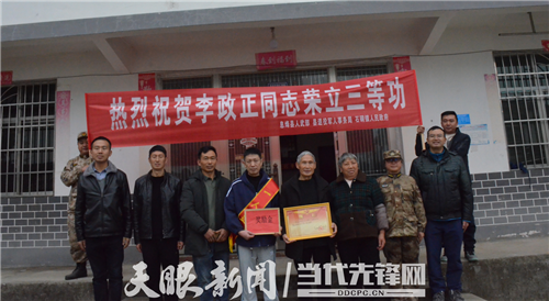 当天,在石硐镇前丰村,伴随着喜庆的鞭炮声,送喜报队伍高举横幅,手捧喜报,为李政正家属佩戴“一人立功 全家光荣”绶带、发放奖励金,感谢他们为部队培养了优秀人才,为家乡赢得了荣誉,并鼓励他们今后一如既往地支持部队工作。