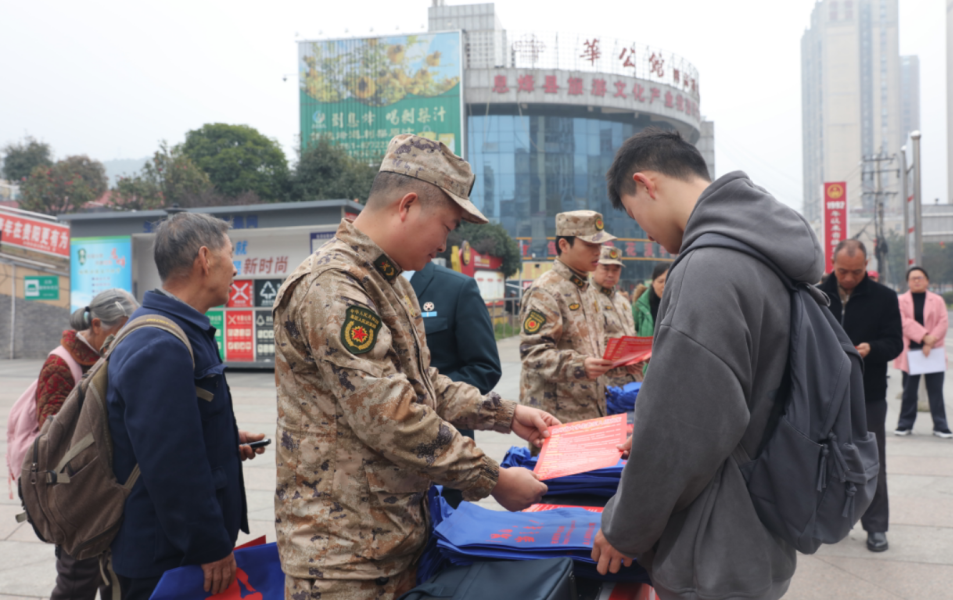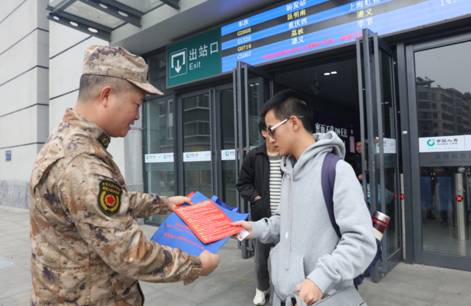寒假来临,高铁站迎来大学生返乡高峰期,近期,息烽县人武部巧抓机遇,在高铁站开展征兵宣传,将征兵宣传单发放到大学生手中,实现离校返乡和征兵报名“精准衔接”。