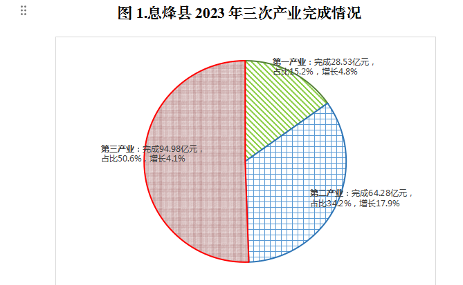 分产业看,第一产业增加值28.53亿元,比上年同期增长4.8%;第二产业增加值64.28亿元,比上年同期增长17.9%;第三产业增加值94.98亿元,比上年同期增长4.1%。三次产业增加值占GDP的比重分别为15.2%、34.2%、50.6%。