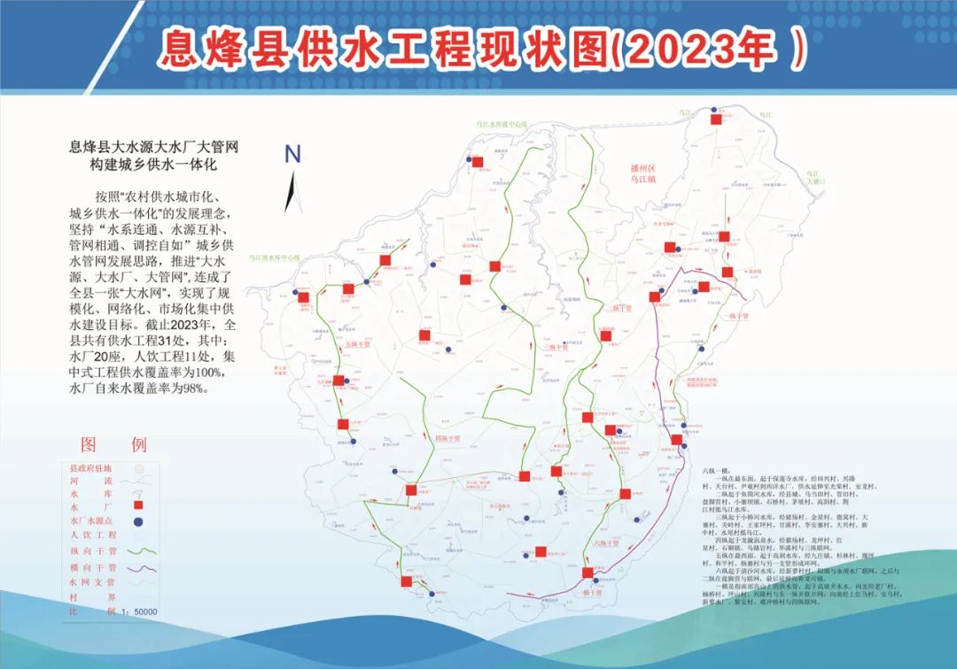 近年来,息烽县通过整合各类资金8.63亿元,实施“大水源”“大水厂”“大管网”三大工程,持续延伸拓展末端供水“毛细血管”,推动供水管网进村入组入户。目前,全县城乡自来水覆盖率达100%,集中式水厂供水覆盖率达98%,水质检测合格率达100%。