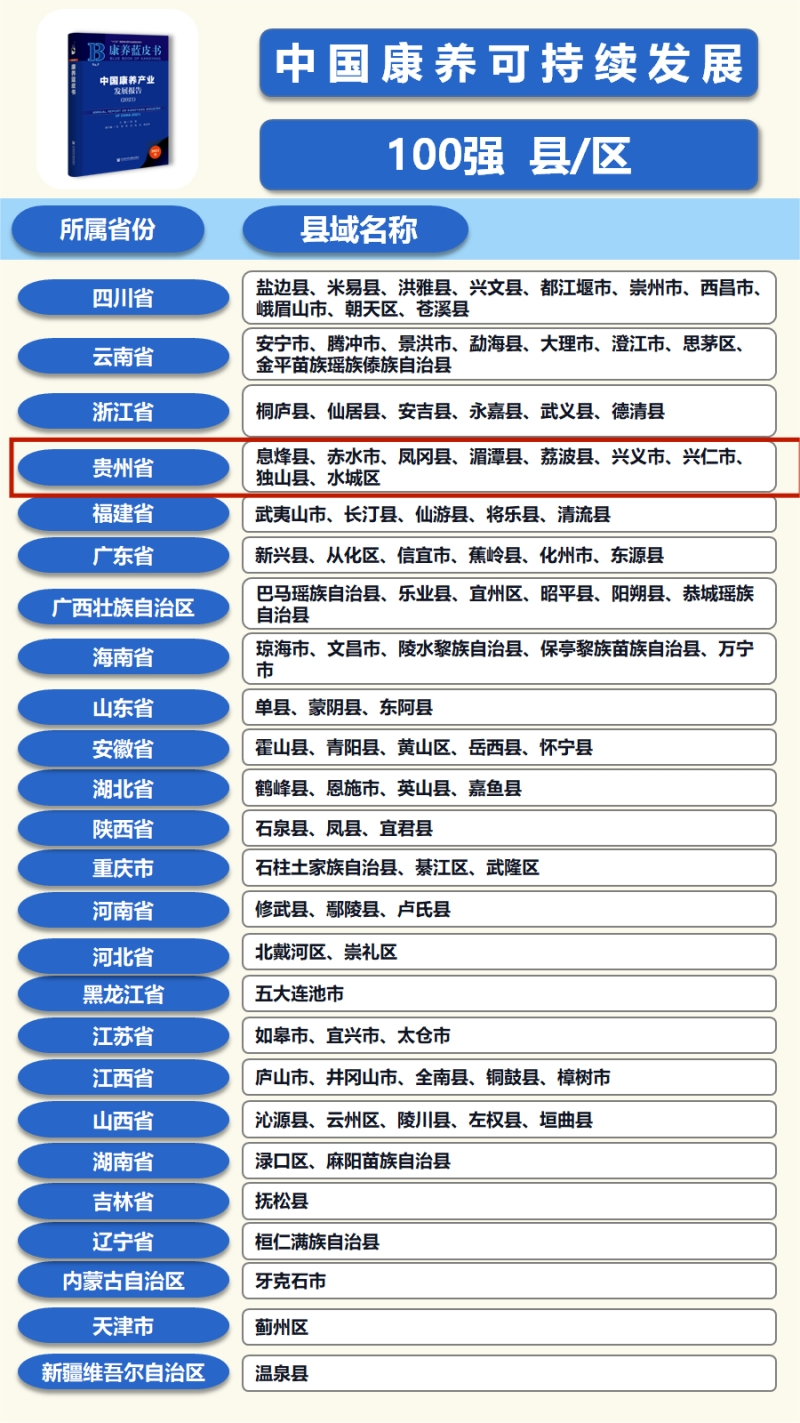 近日,《康养蓝皮书:中国康养产业发展报告(2023)》在安徽省黄山市发布,公布了2023年度全国康养产业可持续发展二十强市榜单和百强县(区)榜单。贵阳市息烽县荣登100强县榜单。