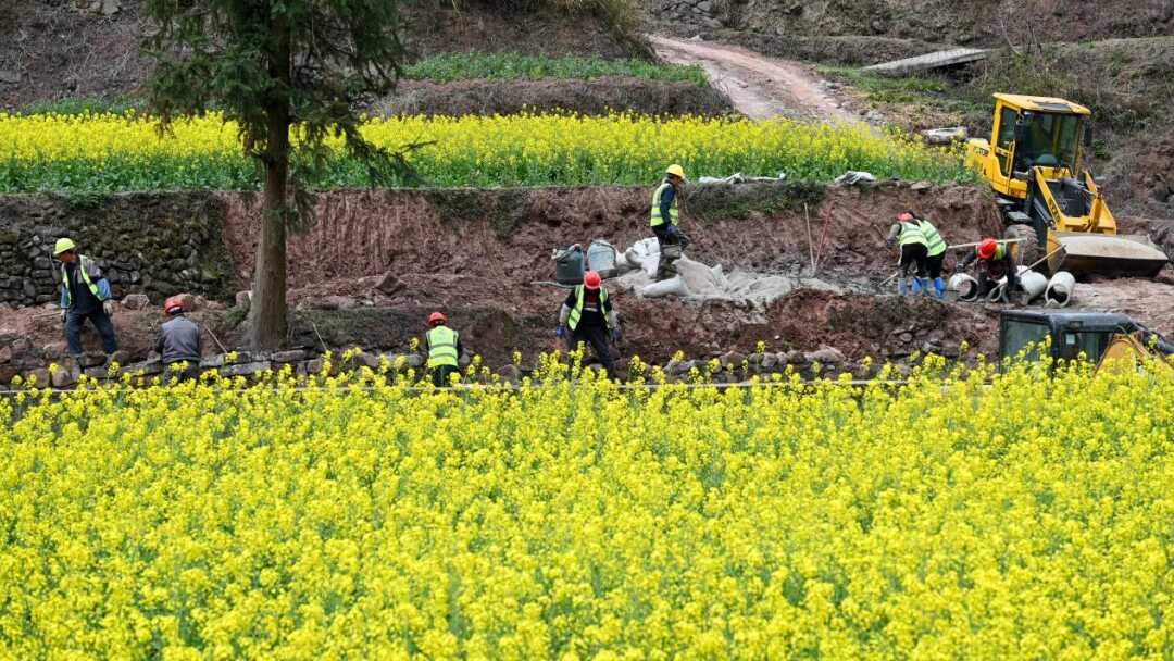 阳春三月,位于息烽县西山镇西望山下的新寨沟村油菜花花开正艳。油菜花田中,息烽县2024年增发国债资金高标准农田项目新寨沟村建设点正加快施工,建设现场,挖掘机在河道里清淤,工人在河岸上搬运石料、搅拌混凝土、运送砂浆、砌筑边墙,一派热火朝天的施工景象。