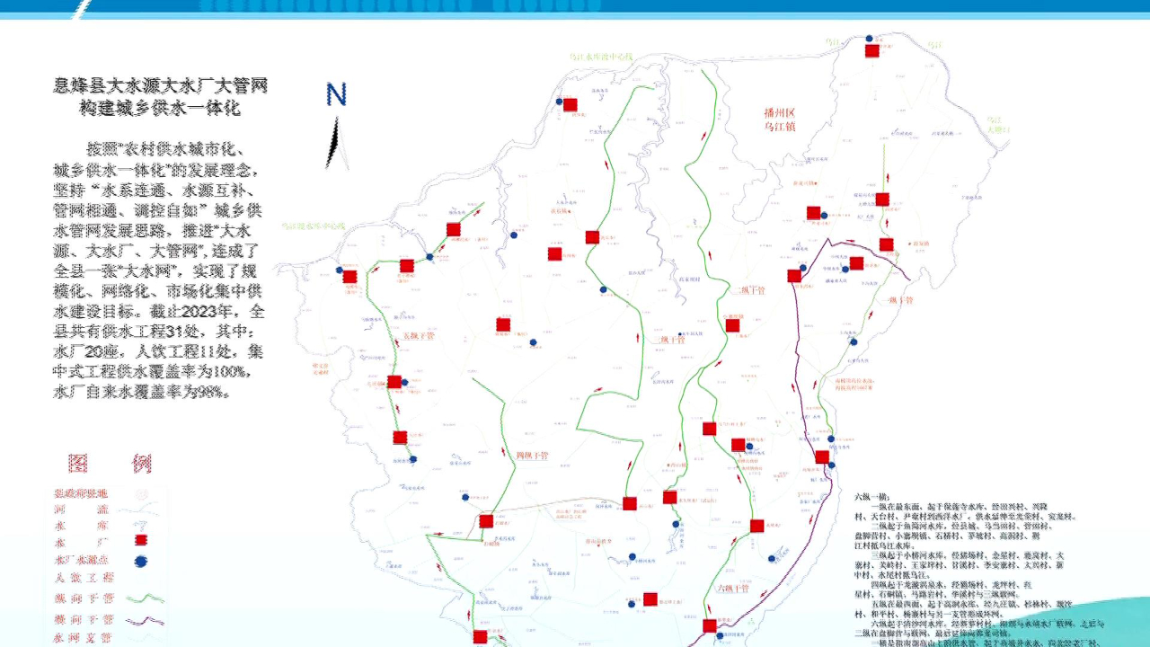 近年来,息烽县按照“农村供水城市化、城乡供水一体化”的理念,坚持“大水源、大水厂、大管网”和城乡供水一体化的目标。截至目前,全县共有农村供水工程31处,覆盖161个行政村。其中,规模化水厂21座,供水覆盖24.41万人。形成了一纵线南起保莲寺水库北至安龙村、二纵线南始鱼简河水库北至乌江水库、三纵起于小桥河水库到水尾村、四纵线从龙漩涡泉水到华溪村与三纵线联网、五纵线起于高洞水库北抵杨寨村、六纵线自清沙河水库延伸到养龙司镇,一横与一纵线和四纵线形成互通。全县集中式供水覆盖率为100%,水厂自来水覆盖率为98%。