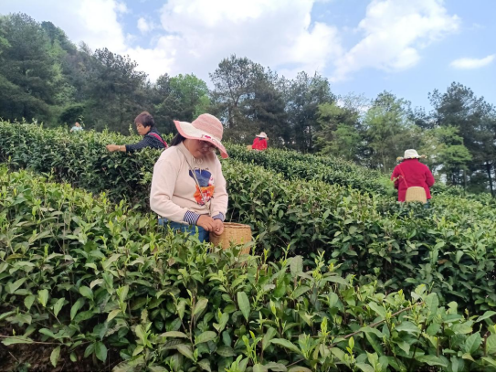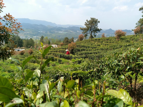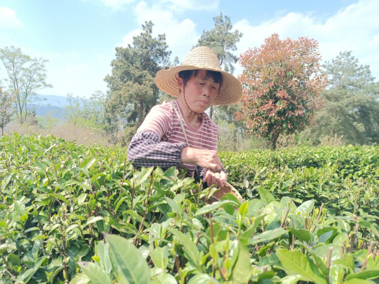 一排排绿油油的茶苗铺满了昔日撂荒的土地,荒地变成了致富宝地。阳光下采茶的村民们穿梭于翠绿茶树中,只见她们双手上下翻飞,将一颗颗饱满的嫩芽装满竹篮。
