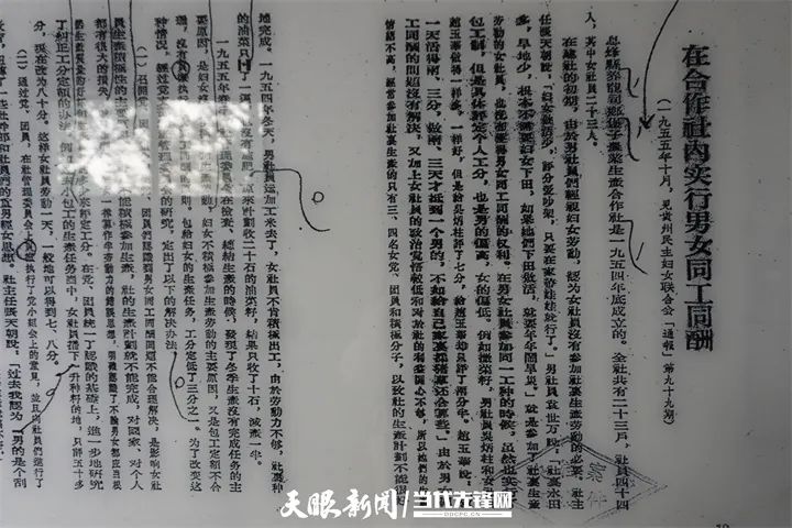 堡子村半边天文化陈列馆内关于毛主席批示堡子村“男女同工同酬”简报的复印件