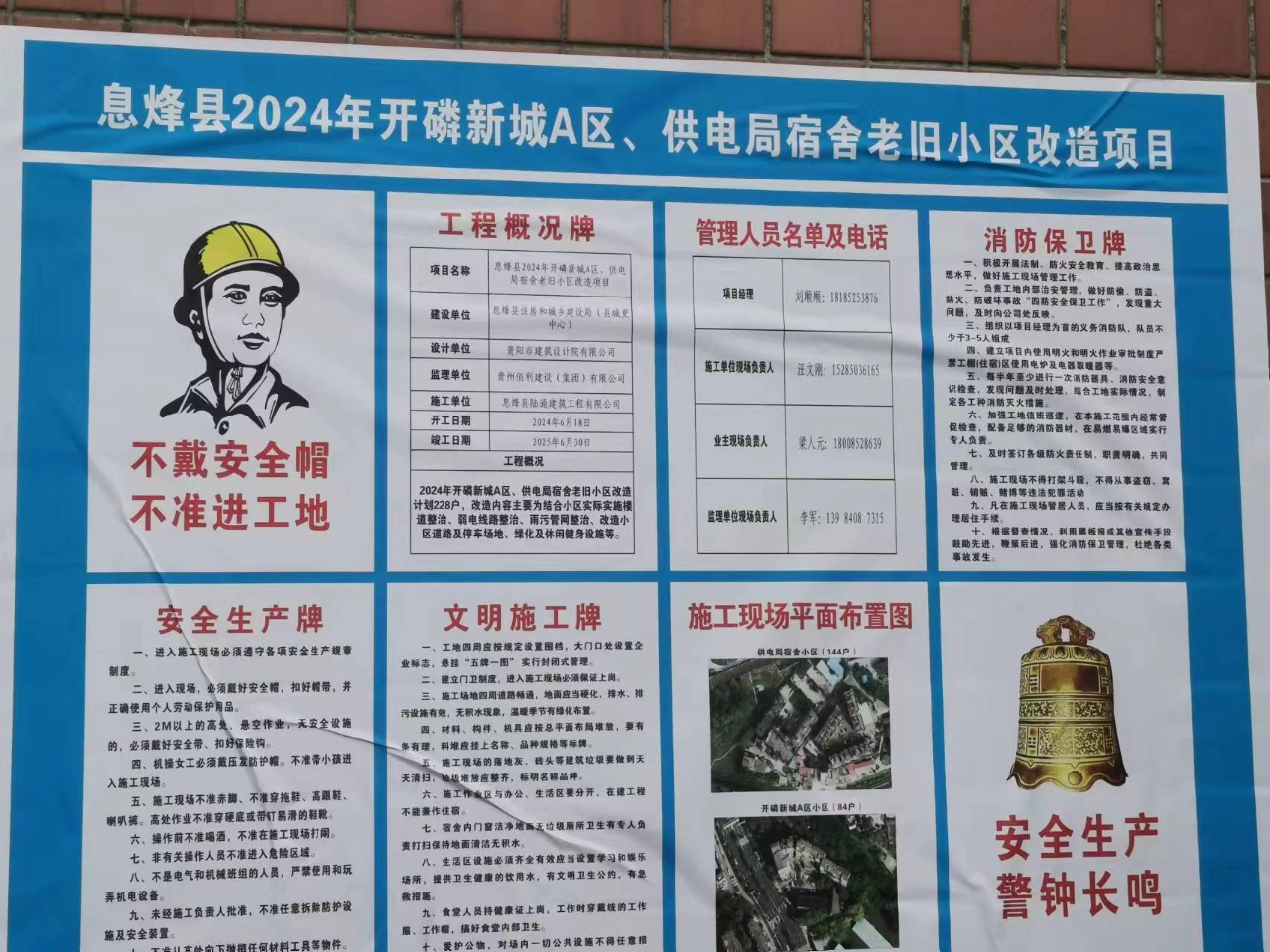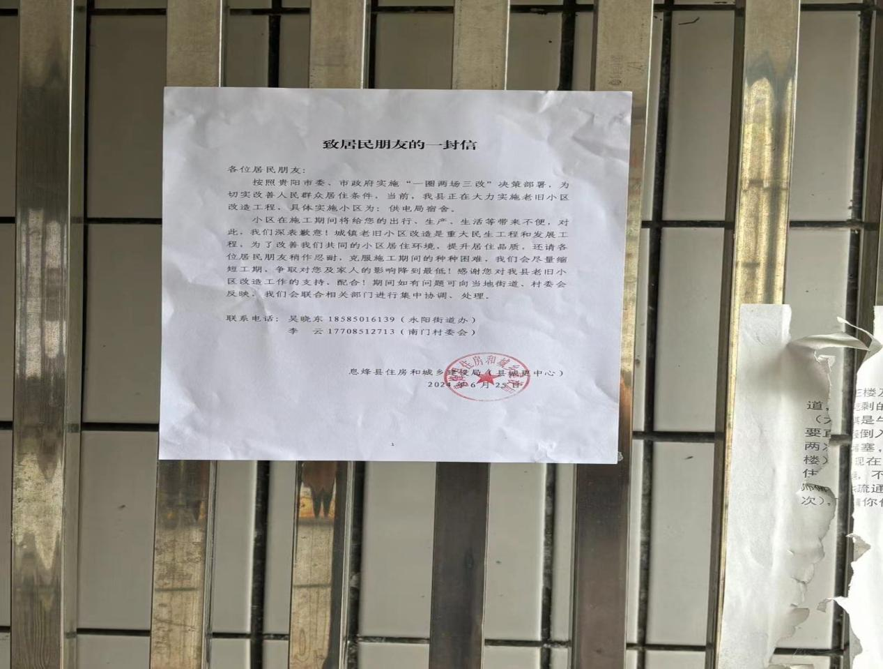 紧贴民生畅通渠道获群众支持与配合。息烽县住房和城乡建设局旧改科在各楼栋张贴“致居民朋友的一封信”及五图一牌,针对改造工作给居民带来的不便,争取理解和支持。并同步公示街道、部门、施工单位联系方式,明确专人及时回应居民反映问题。截至12月,2024年老旧小区改造项目收到电话反映问题3个,已全部完成整改。