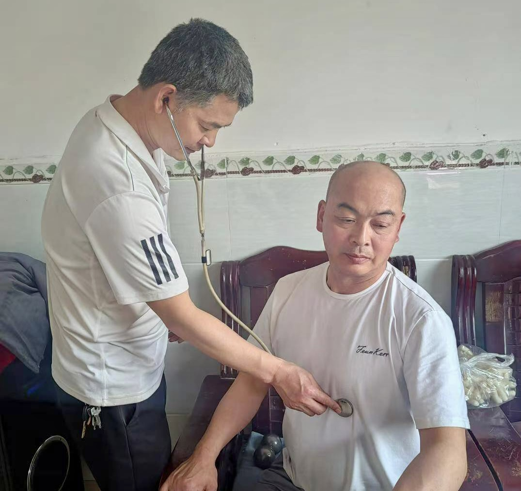 今年夏天的一个深夜,村里独居的老人陈某某突发哮喘病,张前坤闻讯,拎起急救药箱就急急忙忙地赶了过去。氧气袋、雾化器、指夹式血氧仪……他动作麻利,像在村卫生室一样熟练地摆开“阵地”。吸氧、加药、盯数据,寸步不离守到天边泛白,陈某某的呼吸终于由急喘转为平稳。经过一段时间的治疗后,陈某某咳嗽少了,夜里睡得踏实了,逢人就竖起大拇指,“张医生,比我亲人都贴我的心。”