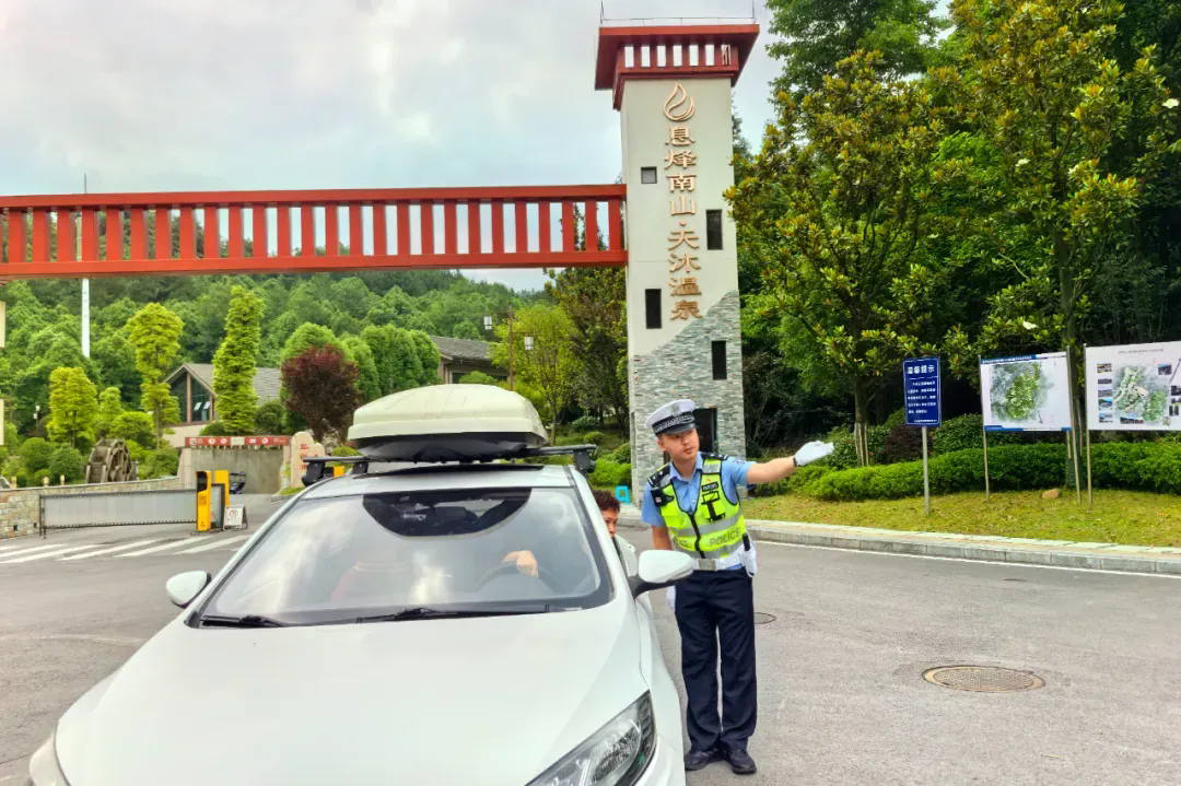 “当前客流较大,请有序通行、不要停留……”在息烽南山天沐温泉景区大门,交警正指挥游客车辆驶入停车场。