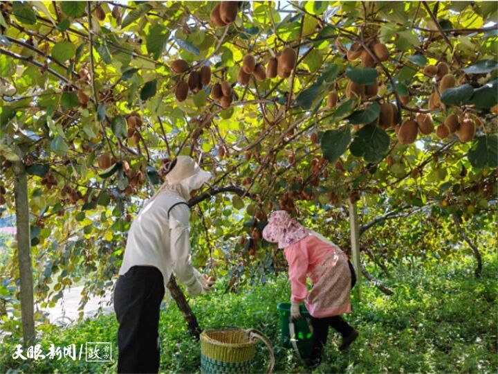 村民们提着背篓,手法娴熟地将猕猴桃采摘、装筐。