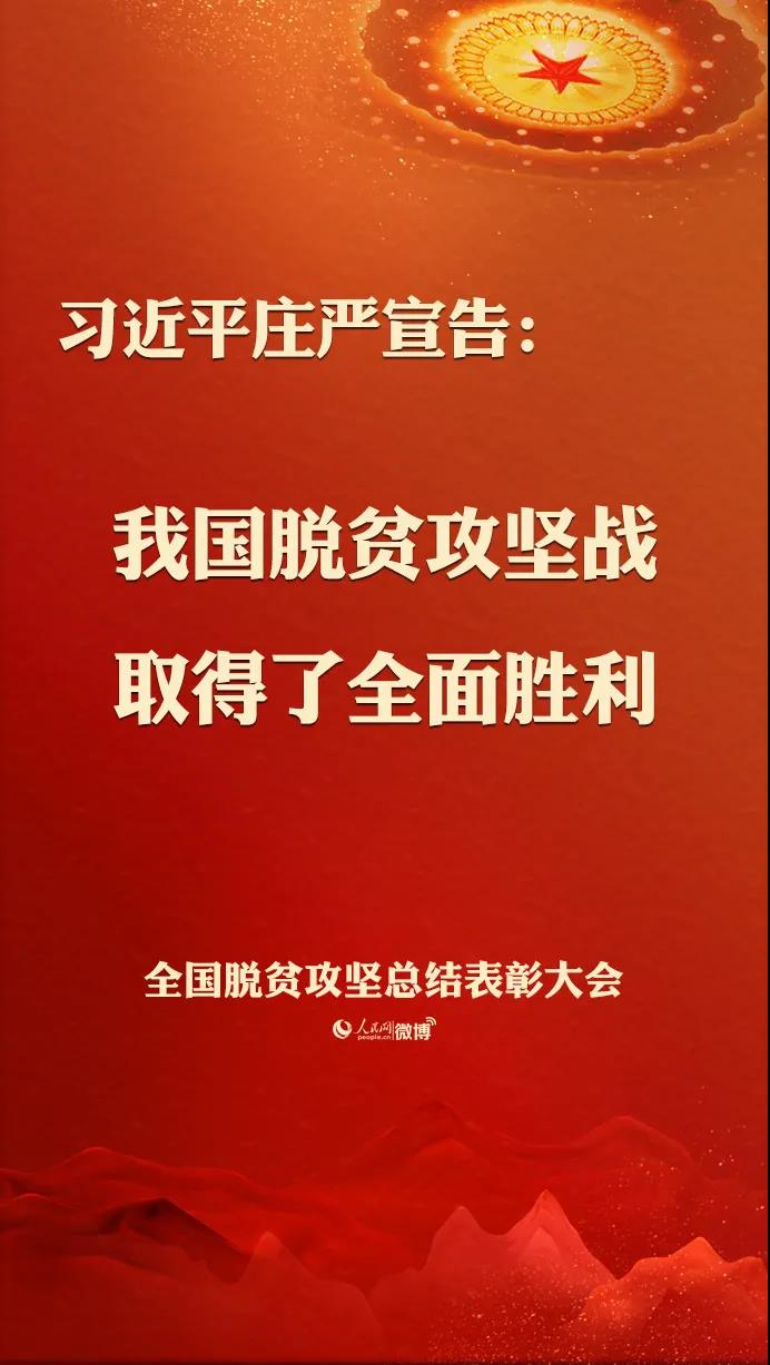 习近平在全国脱贫攻坚总结表彰大会上发表重要讲话,庄严宣告,经过全党全国各族人民共同努力,在迎来中国共产党成立一百周年的重要时刻,我国脱贫攻坚战取得了全面胜利,现行标准下9899万农村贫困人口全部脱贫,832个贫困县全部摘帽,12.8万个贫困村全部出列,区域性整体贫困得到解决,完成了消除绝对贫困的艰巨任务,创造了又一个彪炳史册的人间奇迹!这是中国人民的伟大光荣,是中国共产党的伟大光荣,是中华民族的伟大光荣!