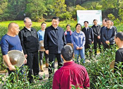 武夷山是乌龙茶、红茶的发源地。习近平来到星村镇燕子窠生态茶园,察看春茶长势,了解当地茶产业发展情况。习近平强调,要统筹做好茶文化、茶产业、茶科技这篇大文章,坚持绿色发展方向,强化品牌意识,优化营销流通环境,打牢乡村振兴的产业基础。要深入推进科技特派员制度,让广大科技特派员把论文写在田野大地上。