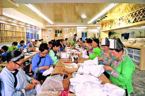 2020年11月23日,贵州省人民政府宣布,全省剩余9个未摘帽的贫困县全部退出贫困县序列。至此,贵州省贫困县全部出列。图为少数民族妇女在贵州省榕江县卧龙易地扶贫搬迁安置小区千匠百艺扶贫车间就业(2020年5月20日)。 新华/传真