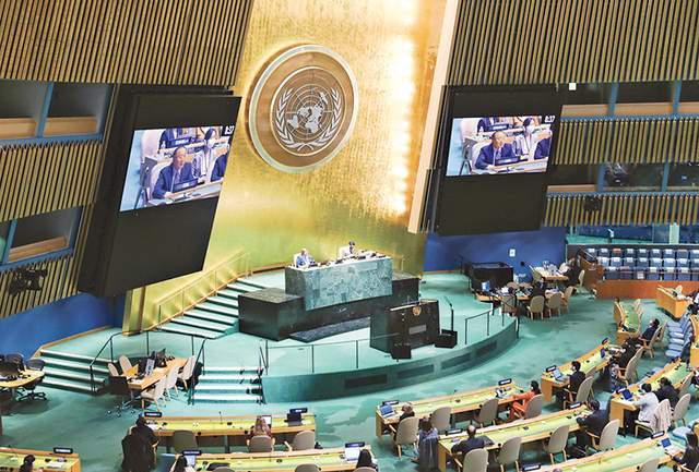 2021年10月7日,在位于纽约的联合国总部,中国常驻联合国代表张军(屏幕上)在第七十六届联合国大会第三委员会一般性辩论中发言。张军在发言中说,中国人民的幸福生活和开心笑容是中国人权状况的最好答案。 新华社记者 王迎/摄
