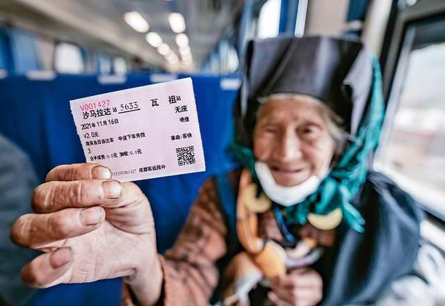 在成昆铁路上,如今依然开通着平均时速不到40公里的5633/5634次列车。这次列车从四川省凉山彝族自治州的普雄开往攀枝花南,票价最高26.5元,最低2元,被誉为大凉山孩子们的校车、彝族同胞的赶集车、民族团结进步的连心车。图为2021年11月16日,一位乘客展示车票。 中国人权图片库供图 刘国兴/摄