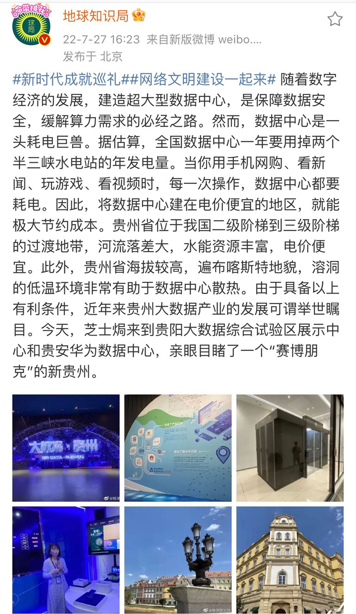 “贵州省位于我国二级阶梯到三级阶梯的过渡地带,河流落差大,水能资源丰富,电价便宜。此外,贵州省海拔较高,遍布喀斯特地貌,溶洞的低温环境非常有助于数据中心散热。由于具备以上有利条件,近年来贵州大数据产业的发展可谓举世瞩目。今天,‘芝士焗’来到贵阳大数据综合试验区展示中心和贵安华为数据中心,亲眼目睹了一个‘赛博朋克’的新贵州。”