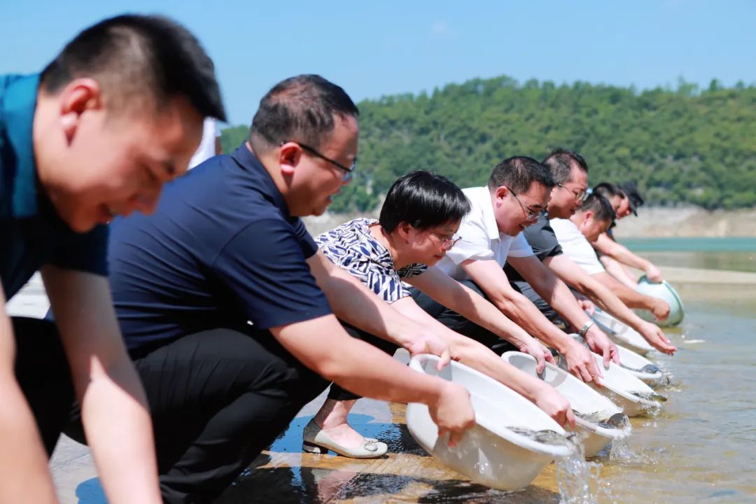 参加人员将符合该水域增殖放流要求的鱼苗投放到河中,促进水生生物资源种群修复和水生态环境改善,以实际行动保护自然生态环境。