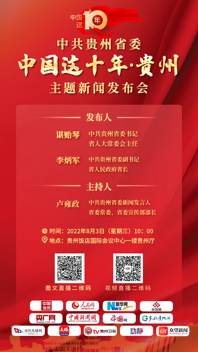 “中国这十年·贵州”主题新闻发布会将于2022年8月3日(星期三)10:00,在贵州饭店国际会议中心一楼贵州厅举行。本场发布会的主题是“千年梦圆新时代 感恩奋进新征程”。中共贵州省委书记、省人大常委会主任谌贻琴,中共贵州省委副书记、省长李炳军出席,介绍有关情况并答记者问。中共贵州省委新闻发言人,省委常委、省委宣传部部长卢雍政主持。