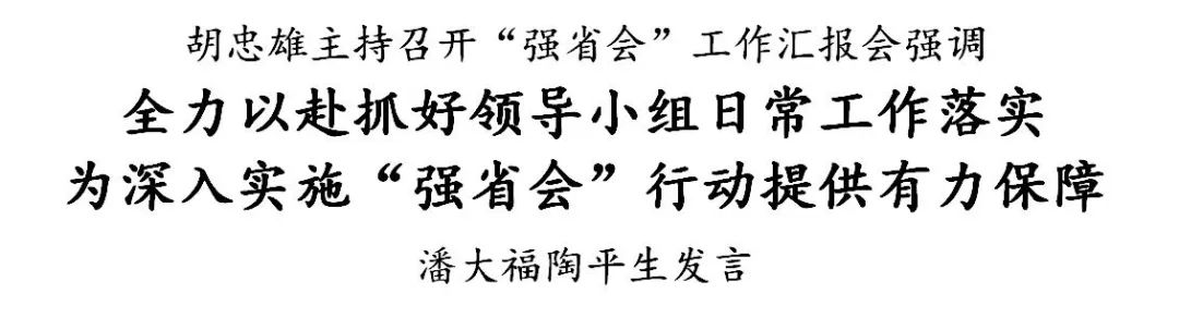 在认真听取省“强省会”工作领导小组办公室、贵阳贵安“强省会”工作领导小组办公室有关工作情况汇报后,胡忠雄指出,今年以来,省“强省会”工作领导小组办公室履职尽责,省直相关部门主动参与,贵阳贵安积极担当,为做好下一阶段“强省会”工作打下良好基础。要认真贯彻落实省委、省政府关于“强省会”行动的决策部署,聚焦项目落地、权限下放、政策支持,进一步建立健全定期召开领导小组会议制度,常态化、制度化推进各项工作,切实形成实施“强省会”行动的强大合力和浓厚氛围,更好辐射带动全省各地高质量发展。