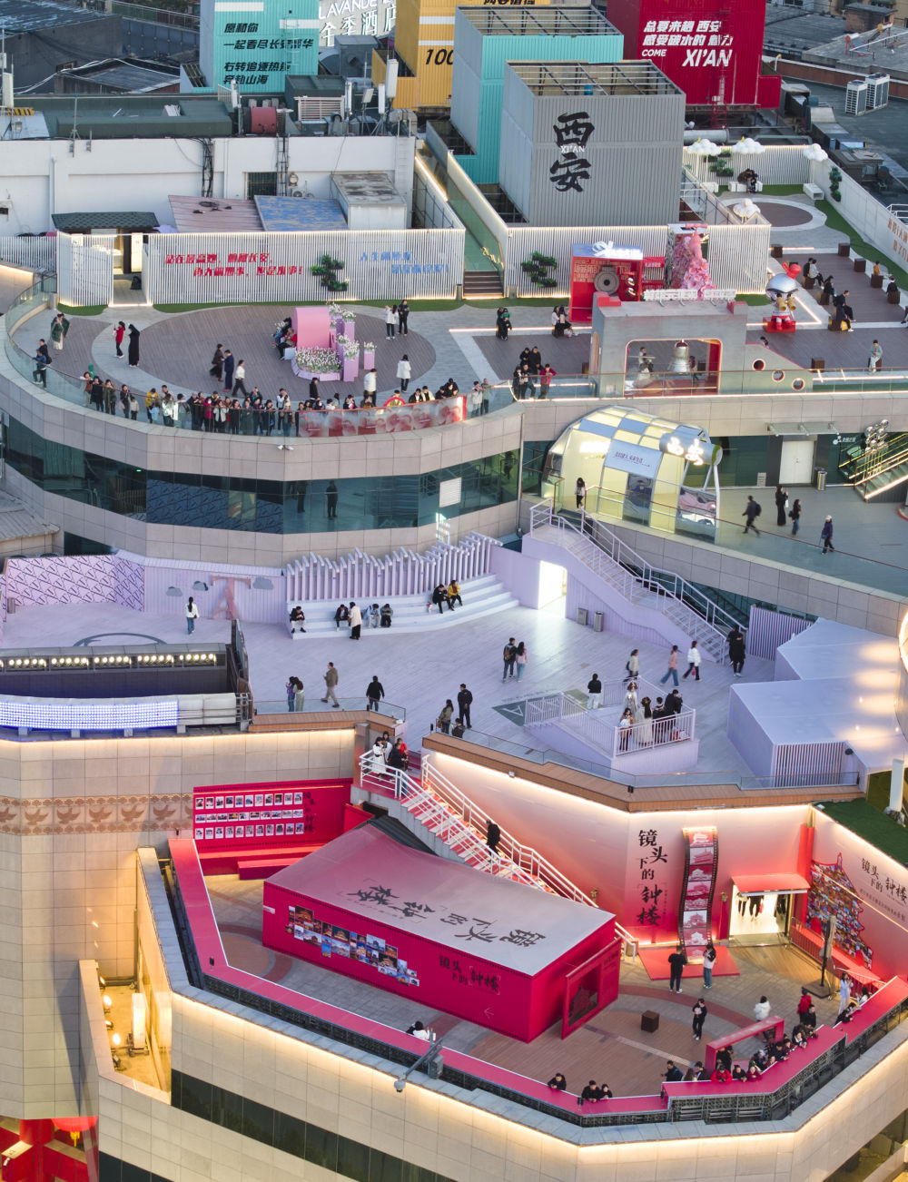 2025年3月19日,游客在西安开元商城观景平台上拍照游玩(无人机照片)。新华社记者 邵瑞 摄