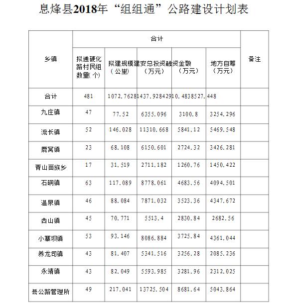 1.根据贵州省农村“组组通”公路三年大决战联席会议办公室《关于下达2018年通组公路建设调整计划的通知》(黔通组联办发〔2018〕8号),贵阳市农村“组组通”公路三年大决战办公室《关于下达2018年农村“组组通”公路建设调整计划的通知》(筑组路办〔2018〕19号),我县2018年通组公路建设计划为481条1072.762公里。项目建安总投资81437.928万元,其中省级补助42910.48万元,需县自筹38527.448万元。项目实施完成后,可实现我县30户以上村民组通硬化路。