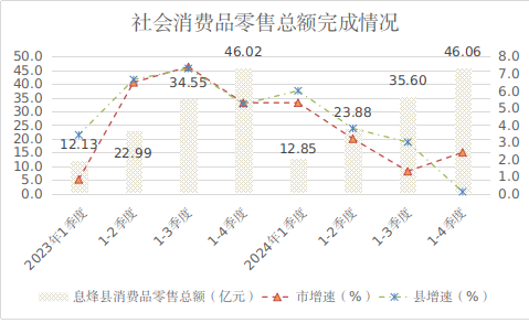 1-4季度,全县实现社会消费品零售总额46.06亿元,同比增长0.1%,增速低于全市(2.4%)2.3个百分点。其中,限额以上消费品零售额完成4.19亿元,同比下降5.7%,低市平均(-2.6%)3.1个百分点。