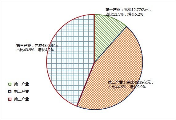 分产业看,第一产业增加值12.77亿元,增长5.2%;第二产业增加值49.39亿元,增长9.9%;第三产业增加值48.69亿元,增长4.2%。三次产业增加值占GDP的比重分别为11.5%、44.6%、43.9%。