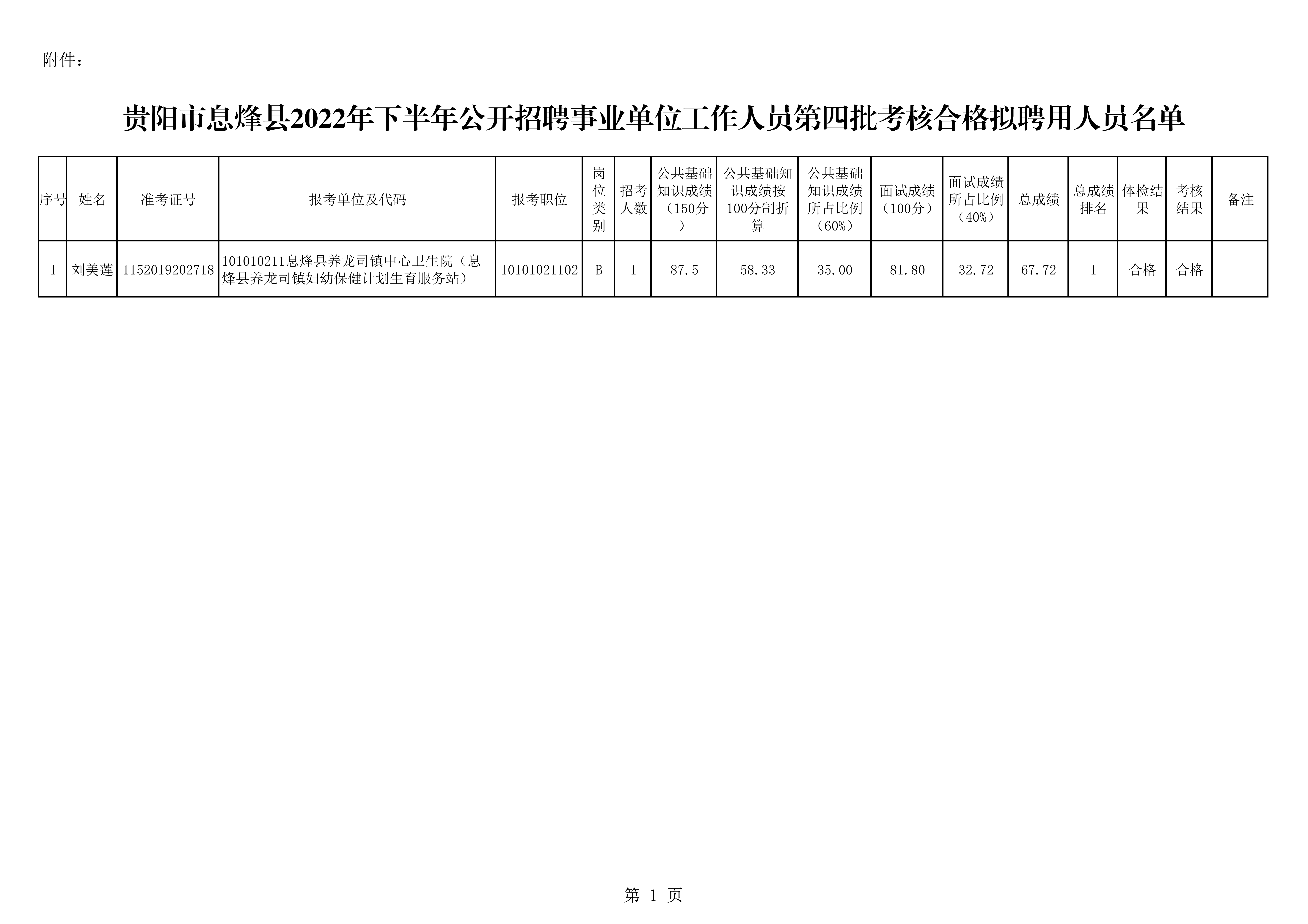 根据《贵阳市2022年下半年公开招聘事业单位工作人员简章》的规定,通过报名、资格初审、笔试、资格复审、面试、体检程序,经各招聘单位考核,现确定刘美莲为第四批考核合格拟聘用人员,经县招聘办公室审核,现予以公示(名单见附件)。