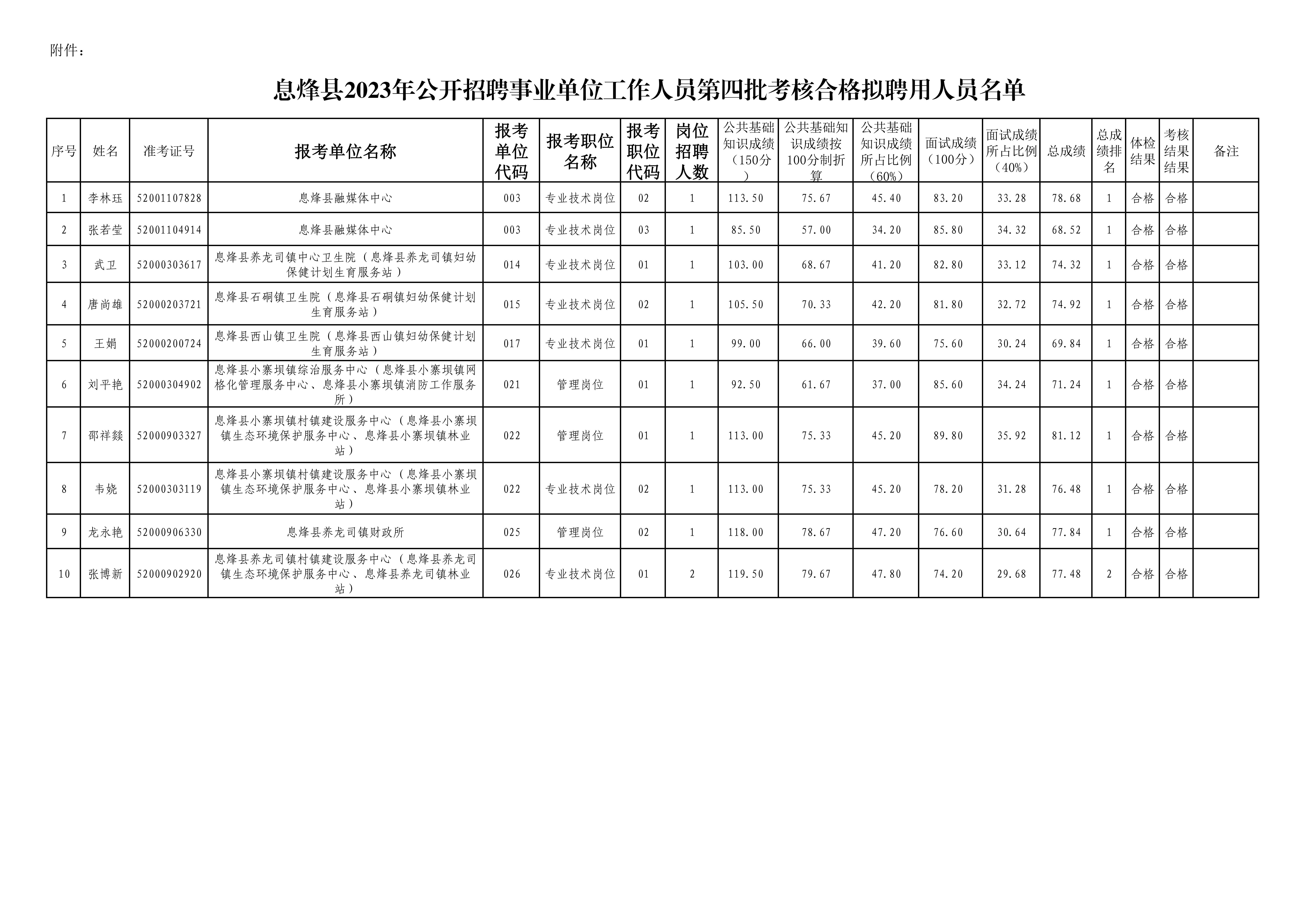 根据《息烽县2023年公开招聘事业单位工作人员简章》的规定,通过报名、资格初审、笔试、资格复审、面试、体检程序,经各招聘单位考核,现确定李林珏等10人为第四批考核合格拟聘用人员,经“县公招办”审核,现予以公示(名单见附件)。