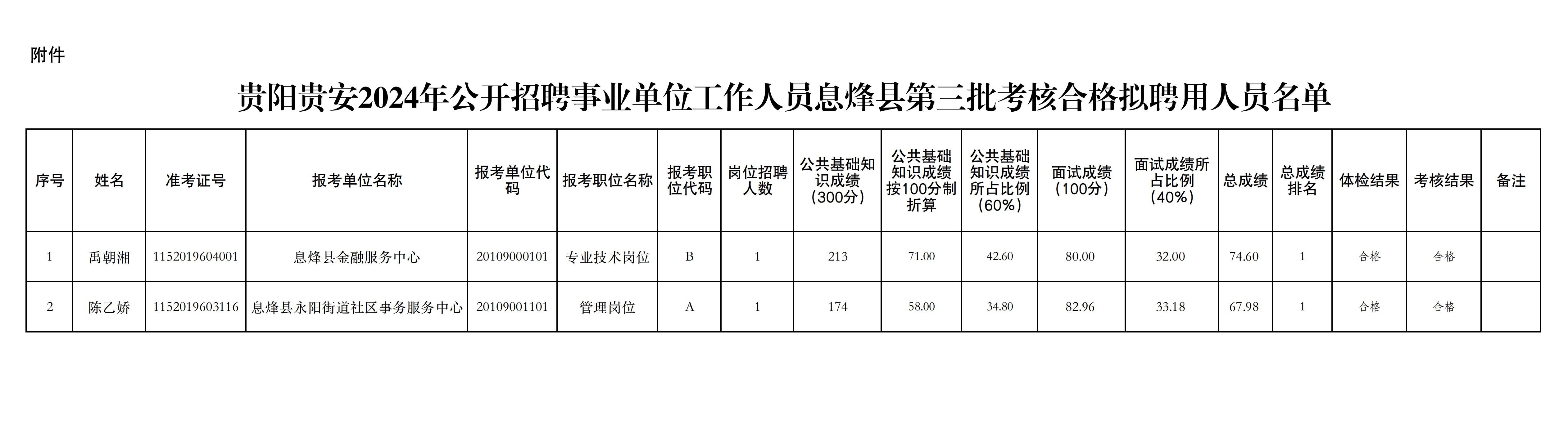 根据《贵阳贵安2024年公开招聘事业单位工作人员简章》的规定,通过报名、资格初审、笔试、资格复审、面试、体检等程序,经各招聘单位考核,现确定禹朝湘等2人为第三批考核合格拟聘用人员,经县人力资源和社会保障局审核,现予以公示(名单见附件)。