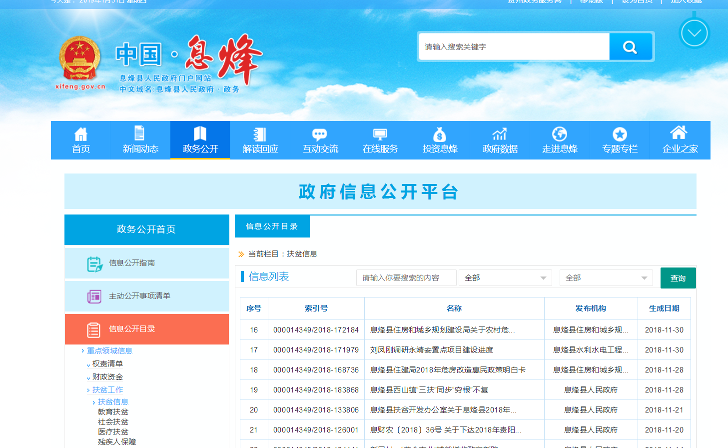 一是推进大扶贫信息公开。以公开助推打好脱贫攻坚“四场硬仗”,通过县政府门户网站、政务微博微信、政务公开栏等平台,及时公开扶贫政策、扶贫规划、扶贫基础设施建设项目、教育扶贫、医疗扶贫、易地扶贫搬迁等信息。比如,在县政府门户网站设置“扶贫工作”专栏,下设“扶贫信息”“教育扶贫”“医疗扶贫”“社会扶贫”等子栏目,公开各类信息211条。