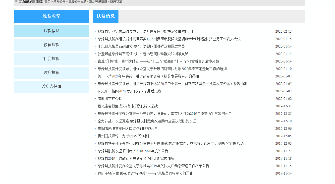 一是推进大扶贫信息公开。以公开助推打好脱贫攻坚“四场硬仗”,通过县政府门户网站、政务微博微信、政务公开栏等平台,及时公开扶贫政策、扶贫规划、扶贫基础设施建设项目、教育扶贫、医疗扶贫、易地扶贫搬迁等信息。比如,在县政府门户网站设置“扶贫工作”专栏,下设“扶贫信息”“教育扶贫”“医疗扶贫”“社会扶贫”等子栏目,公开各类信息186条。