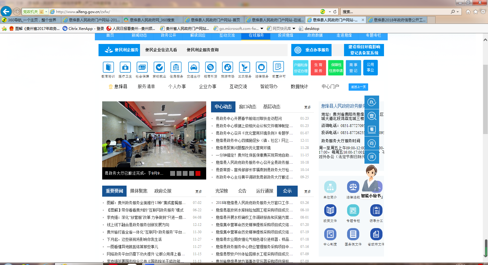 依托贵州政务服务网息烽站点梳理公开审批事项、审批条件、申报材料、审批程序、审批时限、审批部门、承诺时限、办理人员信息、收费标准等,实现了对事项名称、办理条件、过程、结果全面公开,政务服务事项数量3503项,可全程在线办理政务服务事项数量177项,累计办件量28865件。