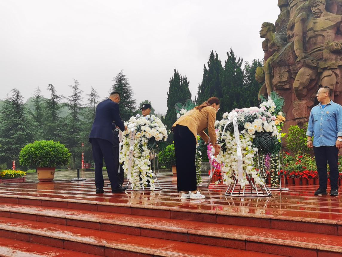 上午10时,全体人员肃立起敬,伴随着《献花曲》,礼兵抬着花篮缓步迈上台阶,向烈士敬献花篮,整理缎带、鞠躬默哀,大家一起深切悼念革命先烈,寄托哀思,告慰英灵。在最后的红歌联唱环节,《我和我的祖国》、《五星红旗》、《没有共产党就没有新中国》……一首首旋律优美、慷慨激昂的歌曲引起大家的强烈共鸣,游客朋友们纷纷参与到合唱中来,挥舞着手中的五星红旗,将整个活动推向高潮。