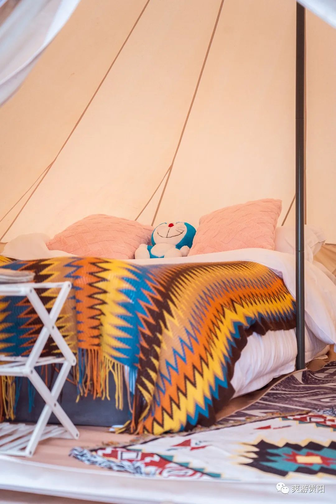 帐篷内部精致温馨,地毯、沙发、柜子均是暖色调,在这里入睡,也能感受家的温馨舒适。