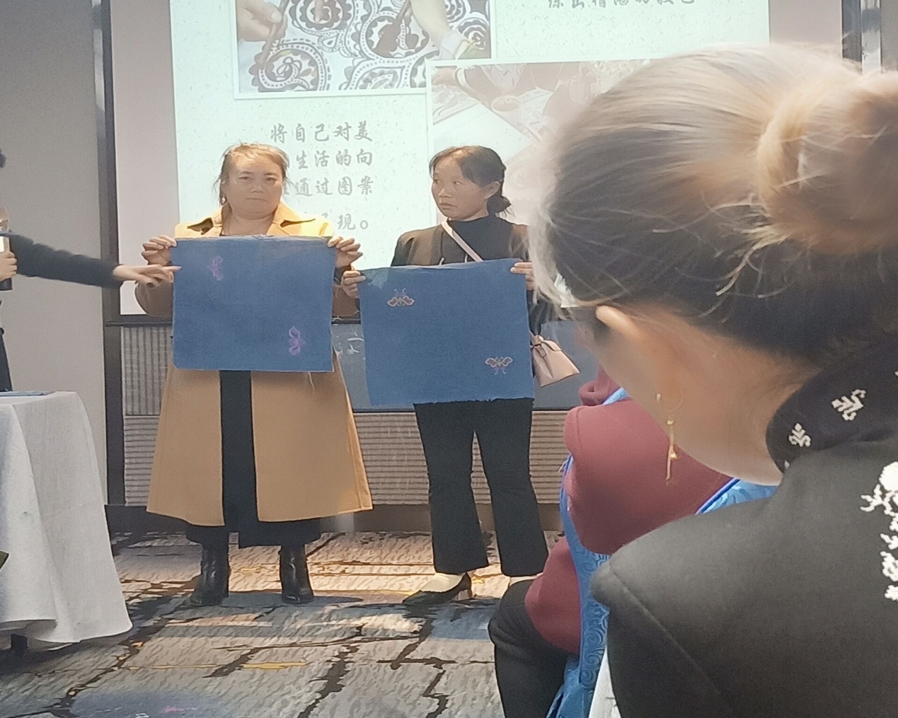 11月20日,黔粹行培训总监张丽丽讲解手工艺品的色彩如何搭配更能让消费者接受以及现在手工艺品市场倾向。下午由民艺专家罗文梅介绍手工艺品如何创造经济效益、工匠精神等,接着让绣娘们展示实践的产品,大家一起进行评价、讨论如何才能让手中的产品产生最大的经济效益。