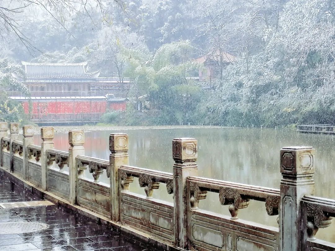 黔灵山公园是城区赏雪的绝佳地。这里海拔在1100米-1396米之间,有着“黔南第一山”的美誉。当纷纷扬扬的雪花落下,山明水秀间,染了一份柔情。