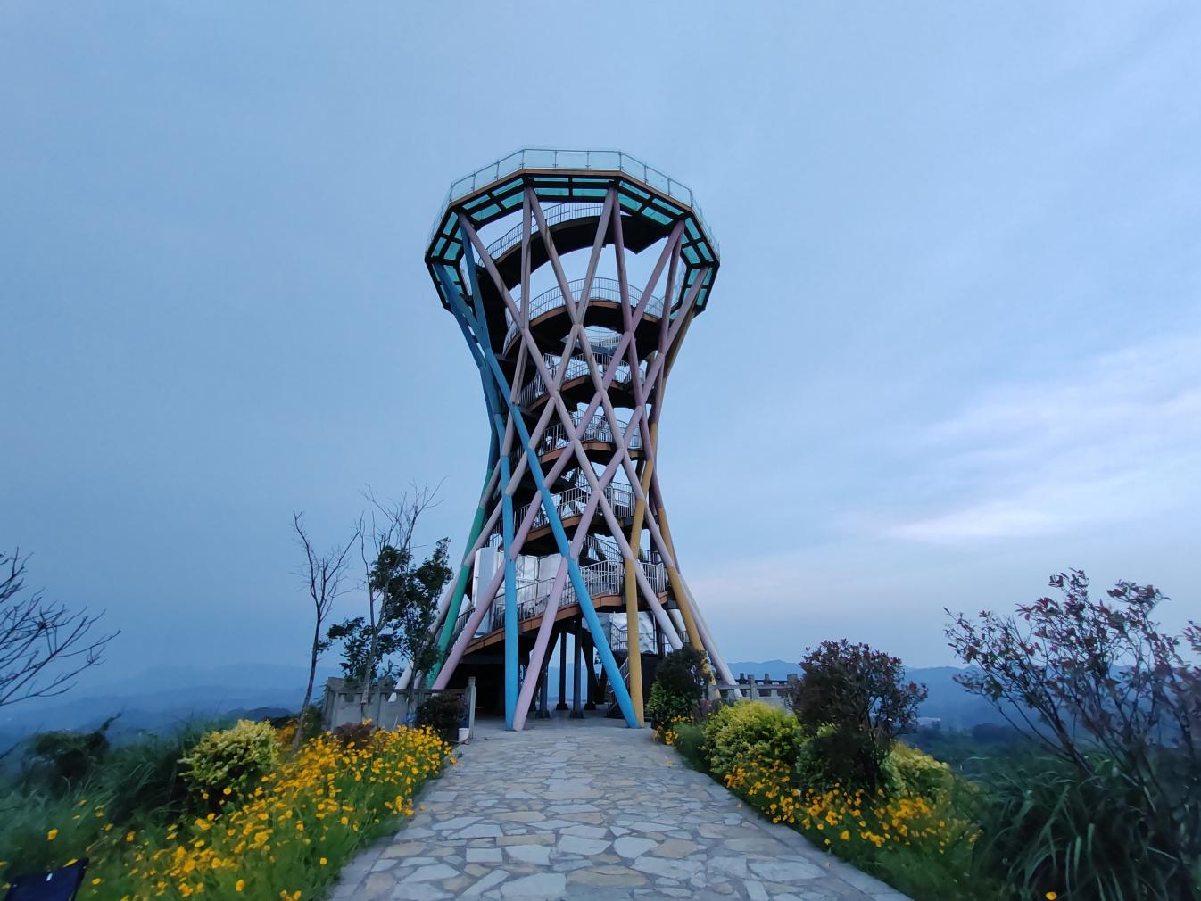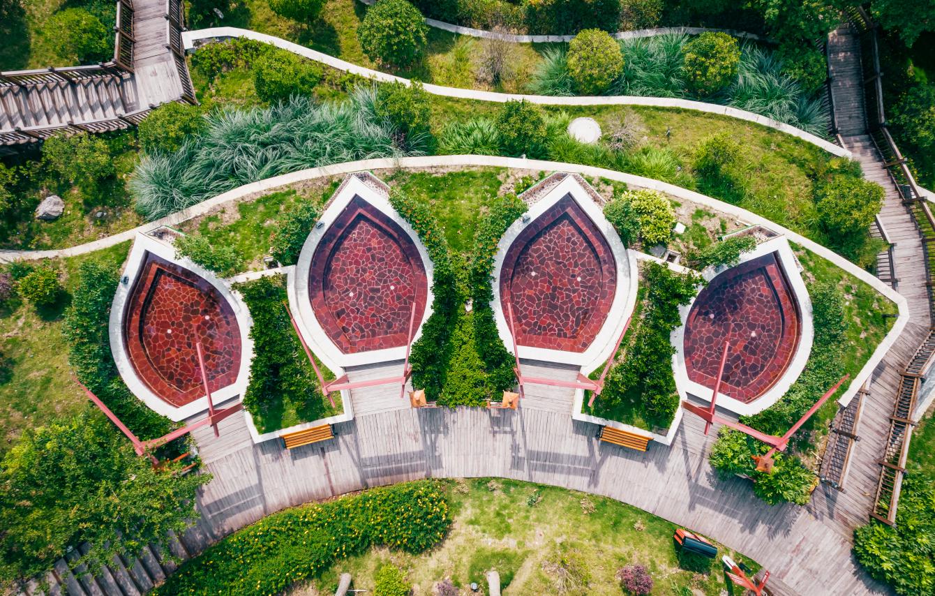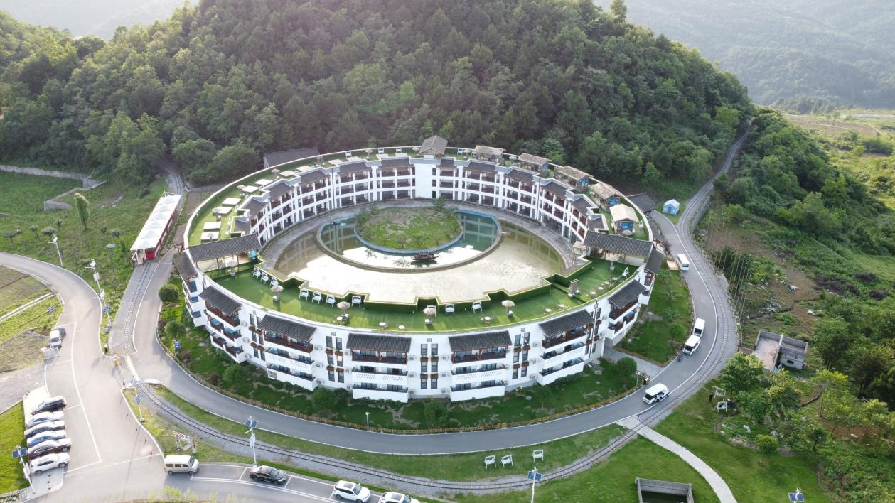 五谷驿度假精品酒店呈圆形围拢式建筑,像极了大鱼海棠里的场景。五谷驿度假精品酒店一共三层,设有一部电梯,中间是桃树、稻田、流水组成的圆形景观。