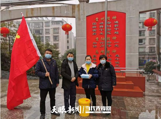 杨显祥(左二)向息烽县新华社区捐送口罩、酒精等防护物资。刘明学 摄