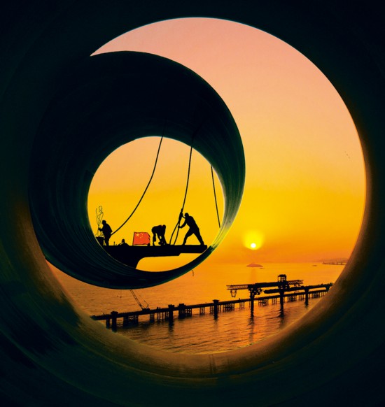 党的十八大以来,在以习近平同志为核心的党中央领导下,全国人民开拓进取,迎难而上,不断推动我国经济走向高质量发展,高铁、公路、桥梁、港口、机场等基础设施建设快速推进,为我国经济保持中高速增长奠定了重要基础。图为始建于2016年11月28日、完工于2018年12月31日的浙江舟山鱼山大桥建设工地。 尚图坊供图 应敏/摄