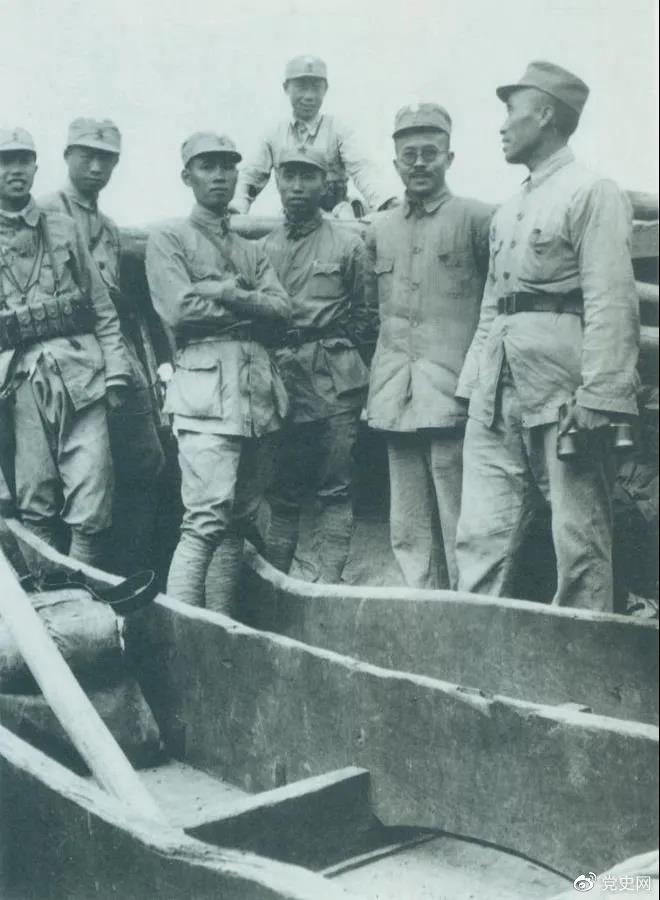 图为渡船上的八路军领导人,前排右起:朱德、任弼时、左权。
