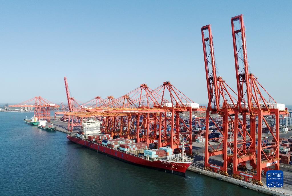 一艘轮船靠泊在唐山港京唐港区集装箱码头装货(4月8日摄,无人机照片)。新华社记者 杨世尧 摄