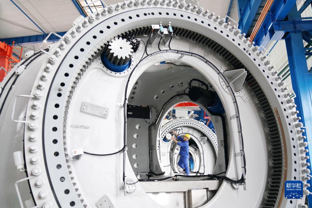 在位于黑龙江省齐齐哈尔市的中国一重集团有限公司风电装备生产制造厂生产车间,工人在进行生产作业(7月1日摄)。新华社记者 王建威 摄