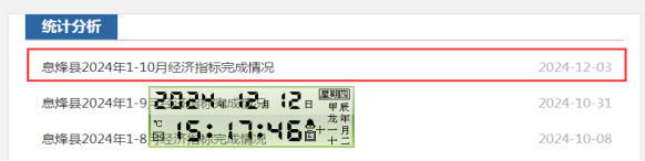 该栏目未及时更新息烽县2024年1—11月经济指标完成情况。建议县统计局按月收集规模以上经济指标完成情况对栏目进行更新维护。