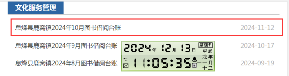 该栏目超过1个月未及时更新信息,未及时更新息烽县鹿窝镇2024年11月图书借阅台账,建议鹿窝镇及时收集相关信息对该栏目进行更新维护。