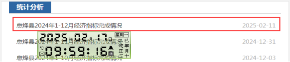 该栏目未及时更新息烽县2025年1月经济指标完成情况。建议县统计局按月收集规模以上经济指标完成情况对栏目进行更新维护。