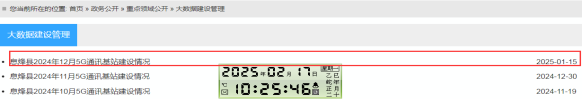 该栏目超过1个月未及时更新维护,未及时更新息烽县2025年1月5G通讯基站建设情况,建议县发展和改革局及时收集相信息对该栏目进行更新维护。