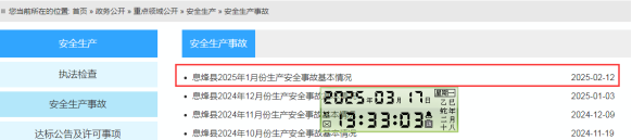 该栏目超过1个月未及时更新信息,未及时更新息烽县2025年2月份生产安全事故基本情况,建议县应急管理局及时收集相关信息对该栏目进行更新维护。